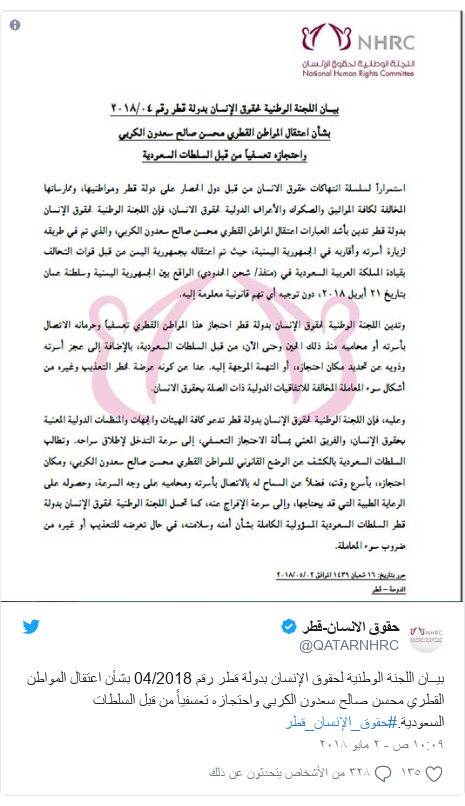 حقوق الانسان قطر على تويتر بيــان اللجنة الوطنية لحقوق الإنسان بدولة قطر رقم 04 2018 بشأن اعتقال المواطن القطري محسن صالح سعدون الكربي واحتجازه تعسفيا من قبل السلطات السعودية حقوق الإنسان قطر Https T Co Av1evgemxv