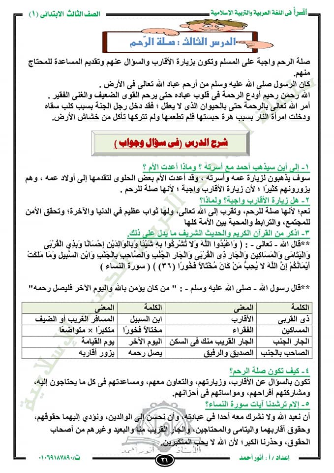 مذكرة مراجعة وشرح تربية دينية للصف الثالث الابتدائى ترم اول 2020