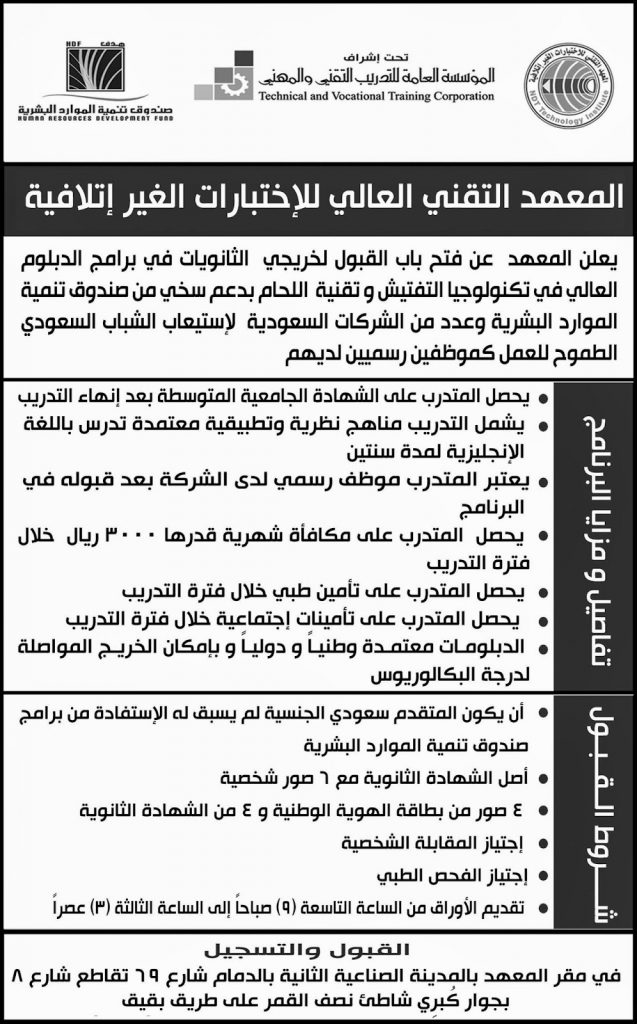 تدريب وتوظيف لخريجي الثانوية العامة والصناعية مكافأة 3000 ريال