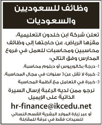 درجة البكالوريوس في المحاسبة أو المالية. مدارس ابن خلدون. أعلنت شركة ابن خلدون التعليمية في مدينة الرياض عن توفر وظائف تعليمية وإدارية وإشرافية شاغرة للرجال وللنساء بمسمى مصادر تعل م سكرتير مدخل بيانات مراقب تعليمي قائدات وكيلات مشرفات تربويات ووظائف تعليمية. لدى سمروظيفة واحدة مدرجة على الملف الشخصي عرض الملف الشخصي الكامل على linkedin وتعرف على زملاء سمر والوظائف في الشركات المماثلة.