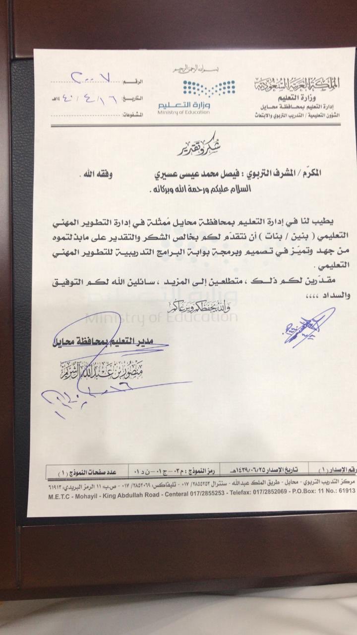 فيصل المشايخ على تويتر تعليم محايل عسير تلقينا صباح اليوم خطاب شكر وتقدير من سعادة مدير إدارة التعليم بمحايل الأستاذ منصور بن عبدالله آل شريم وذلك لتصميمنا وبرمجة بوابة البرامج التدريبية للتطوير المهني بمحايل