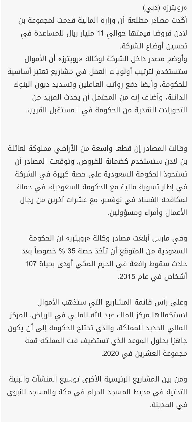 هاشتاق السعودية On Twitter توقعات بأن تأخد الدولة حصة 35 منها المالية تقدم قروض ا مالية لشركة بن لادن قيمتها حوالي 11 مليار ريال لتحسين أوضاعها عكاظ Https T Co Ojux505fom