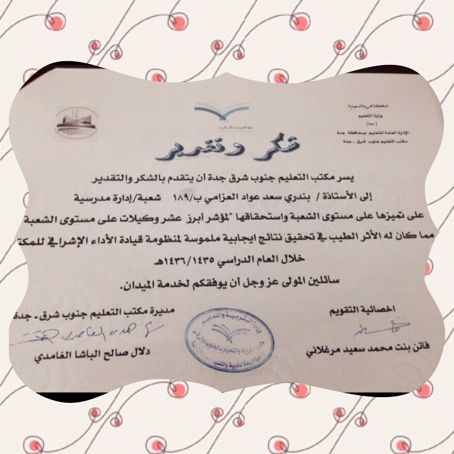 الإبتدائية 189 للبنات بجدة مبروك أستاذة بندري على تميزك من ضمن أبرز عشر وكيلات في مركز جنوب شرق