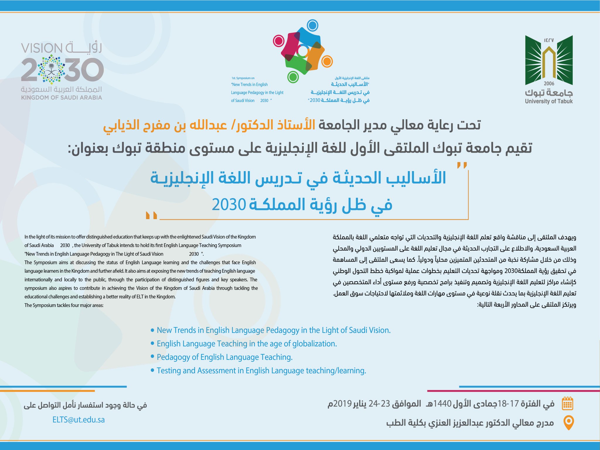 جامعة تبوك On Twitter دعوة برعاية معالي مدير جامعة تبوك أ د عبد الله بن مفرح الذيابي تنظم الجامعة الملتقى الأول للغة الإنجليزية تحت شعار الأساليب الحديثة في تدريس اللغة الإنجليزية في ظل رؤية المملكة2030 في الفترة من