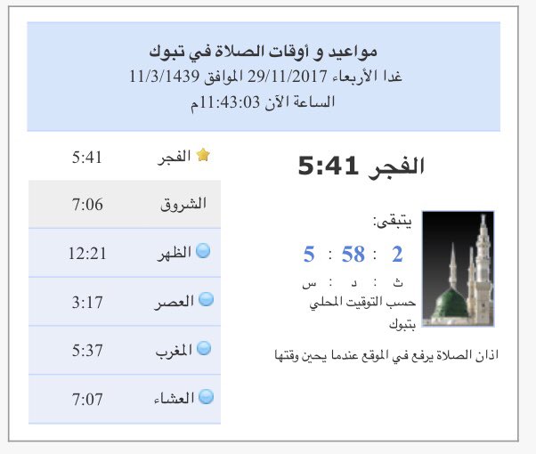 موقع مواقيت الصلاة لجميع بلدان العالم وستجد مواقيت الصلاة لصلاة الفجر وصلاة الظهر وصلاة العصر وصلاة المغرب وكذالك صلاة العشاء ويتم رفع الأذان من خلال الموقع. اوقات الصلاة في تبوك قد ت ختلف عن أوقات الصلاة في م دن ومحافظات المملكة العربية حيث ي نظر في ذلك ح سب. أوقات الصلاة والأذان في تبوك في يوم الإثنين 07 09 2020. أحصل على مصدر موثوق للأذان ومواقيت الصلاة في تبوك مع امكانية عرض المواقيت.