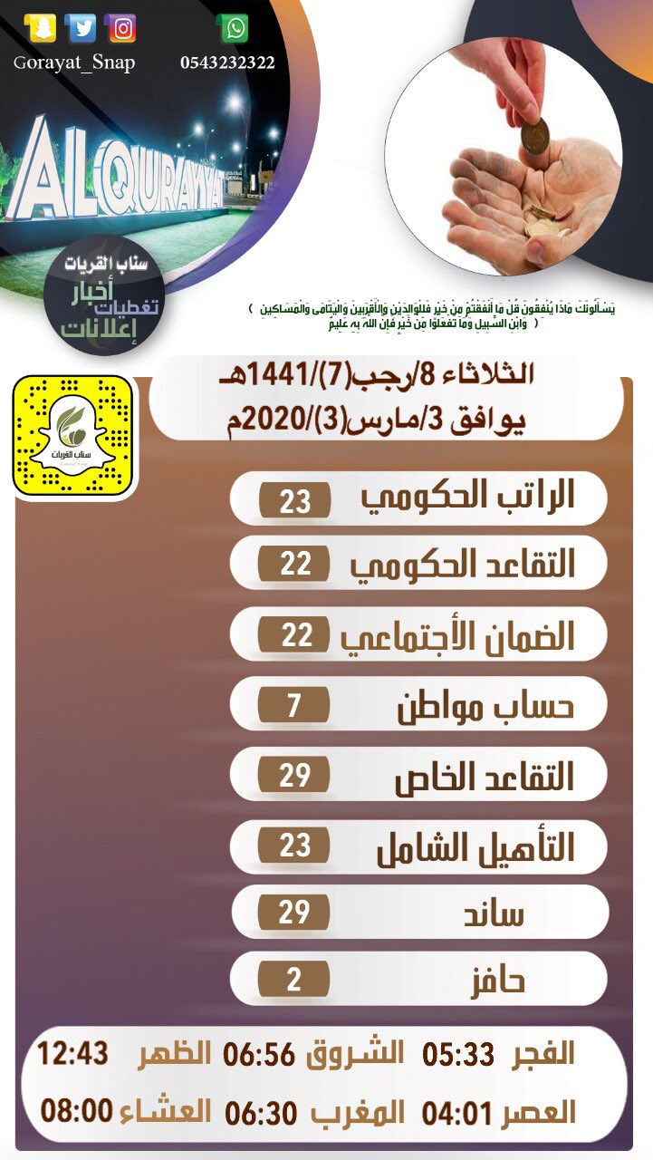 سناب القريات نعود بحذر Pa Twitter الثلاثاء 8 رجب 7 1441هـ يوافق 3 مارس 3 2020م أيام متبقية مواقيت الصلاة