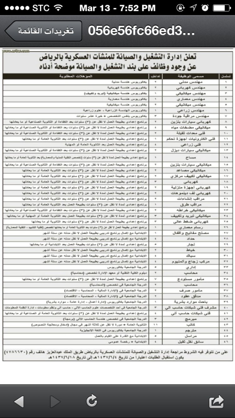 قامت إدارة التشغيل والصيانة للمنشآت العسكرية بالإعلان على موقعها عن وظائف هندسية و فنية و إدارية على بند التشغيل شاغرة. وهي على النحو التالي. اعلنت وزارة الدفاع عن توفر 30 وظيفة للرجال في إدارة التشغيل والصيانة للمنشآت العسكرية بالرياض على بند التشغيل والصيانة لحملة البكالوريوس والدبلوم والثانوية التفاصيل أدناه. ميكانيكي مضخات عدد 2 ميكانيكي مصاعد.