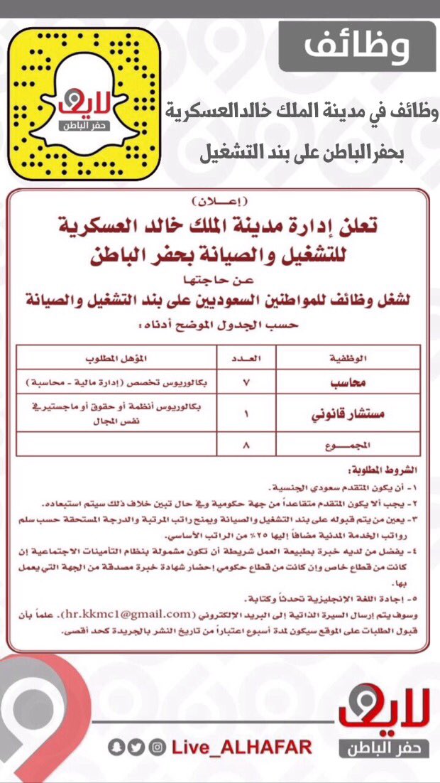 King khaled military city directorate if operations maintenance المنطقة الشمالية حفر الباطن ص ب. تعلن إدارة مدينة الملك خالد العسكرية للتشغيل والصيانة بحفر الباطن عن حاجتها لشغل عدد 36 شاغر للوظائف التالية بمواطنين سعوديين على بند التشغيل والصيانة بحسب الجدول الموضح أدناه. 10023 tel 03 7871050 fax 03. كشفت إدارة مدينة الملك خالد العسكرية للتشغيل والصيانة بحفر الباطن عن وجود 422 وظيفة شاغرة إدارية فنية هندسية حرفية على بند التشغيل والصيانة لحملة كافة المؤهلات.