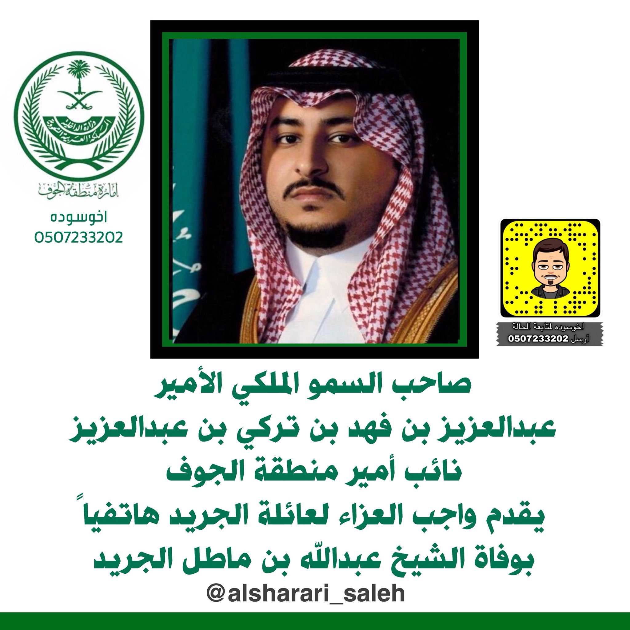 اخوسوده صالح أبورياض On Twitter صاحب السمو الملكي الأمير عبدالعزيز بن فهد بن تركي بن عبدالعزيز نائب أمير منطقة الجوف حفظه الله يقدم واجب العزاء لعائلة الجريد هاتفيا بوفاة