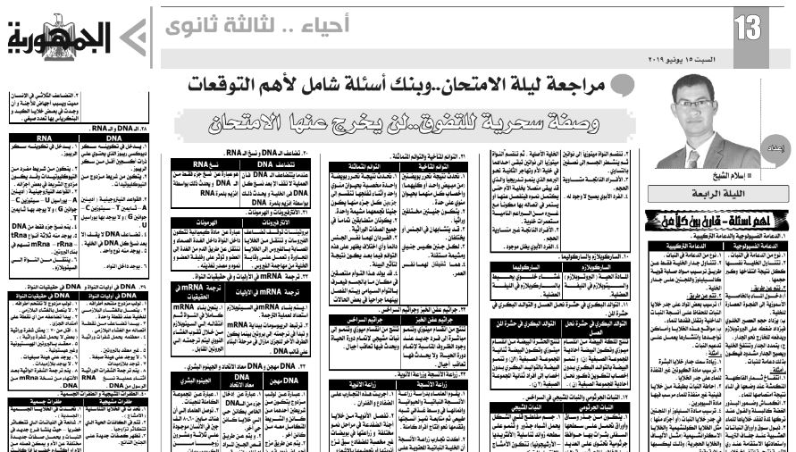 اجابة وحل امتحان مادة الأحياء للثانوية العامة 2019 علمى علوم نموذج الاسئلة والاجابة