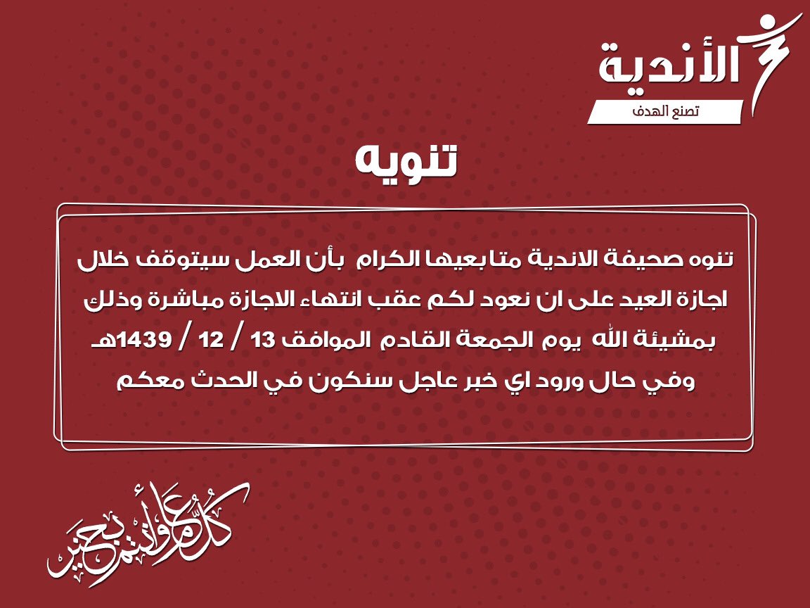 O Xrhsths صحيفة الاندية Sto Twitter تبارك صحيفة الاندية لمتابيعها بمناسبة حلول عيد الاضحى المبارك و تنوه عن موعد العودة من اجازة العيد المبارك عيد اضحي مبارك عيدكم مبارك Https T Co Qdmvhe96bn