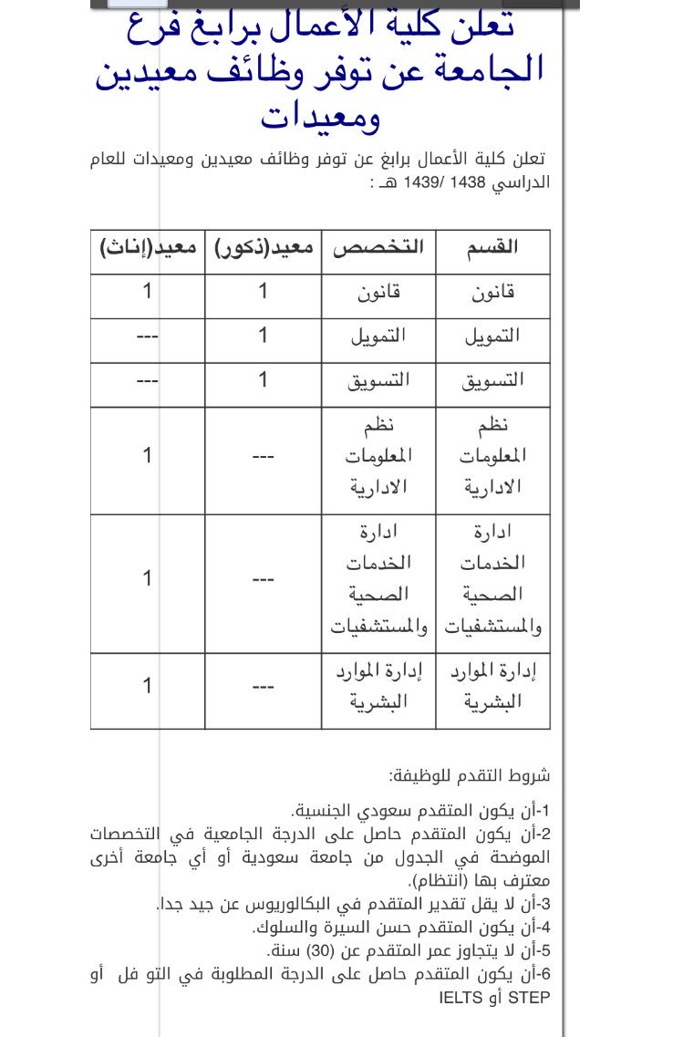 اعلان وظائف معيد ه ومحاضر ه شاغره للعام 1438 1439 اتوقع نفس التوصيات تبع الدراسات العليا بس من ضمن الشروط مكتوب ان تكون الدراسة لجميع المؤهلات الجامعية بالانتظام الكلي.