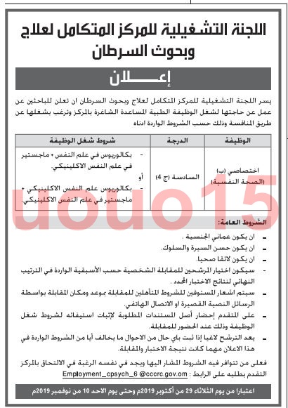 وظائف اللجنة التشغيلية للمركز المتكامل لعلاج وبحوث السرطان وظائف شاغرة فى سلطنة عمان