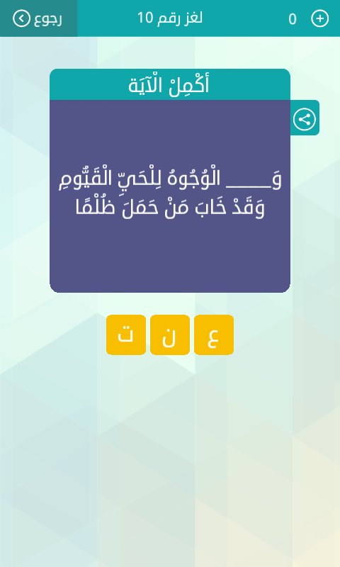 حل اكمل الايه و الوجوه للحي القيوم وقد خاب من حمل ظلما لغز رقم 10 من لعبة وصلة من المجموعة الث صقور الإبدآع