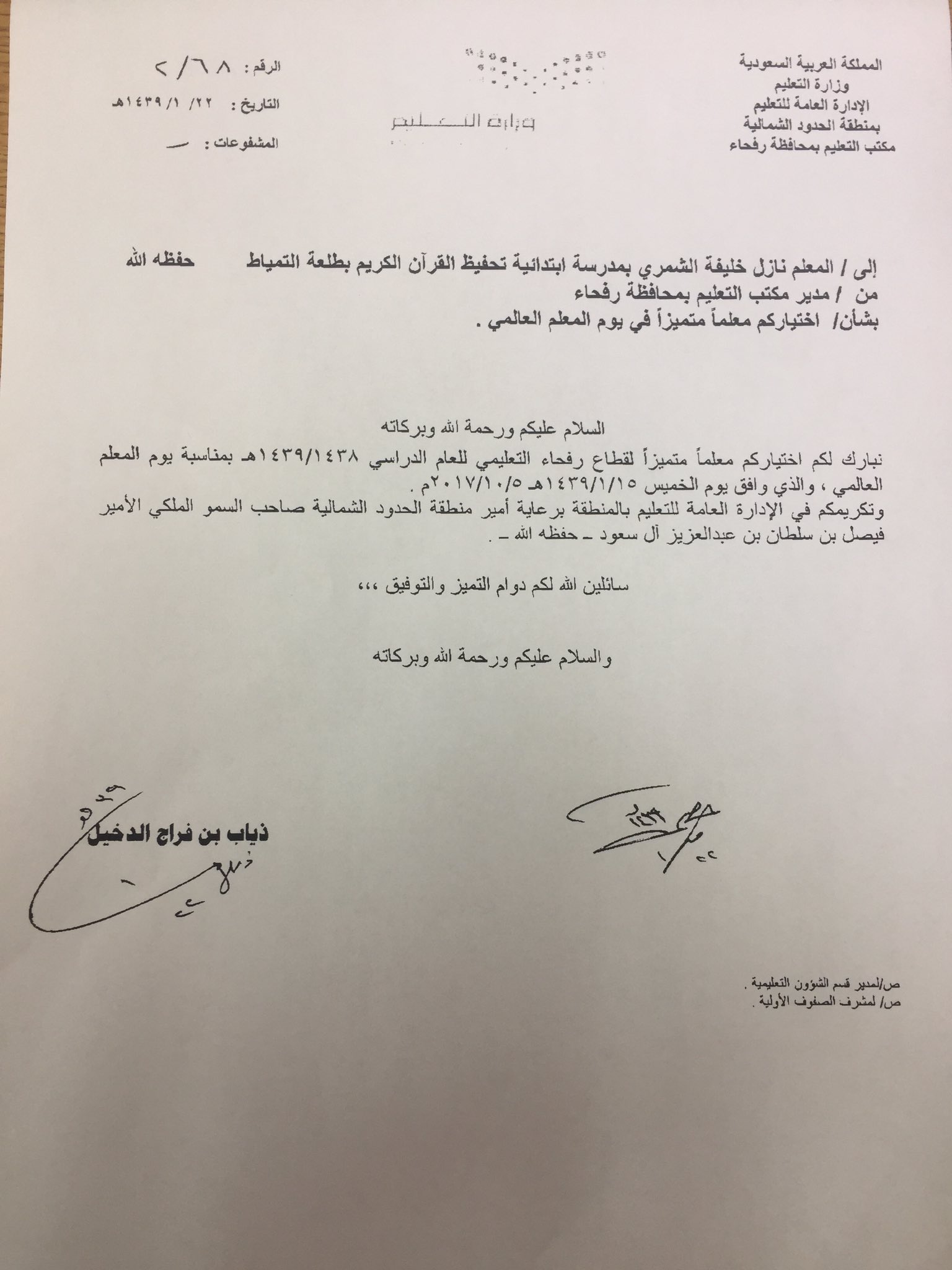 نازل خليفة النجباني On Twitter أشكر الاستاذ ذياب فراج الدخيل والمشرفين ومكتب الاشراف منحهم لي المعلم المميز في يوم المعلم العالمي على مستوى قطاع رفحاء Https T Co 6vyyaaxct9